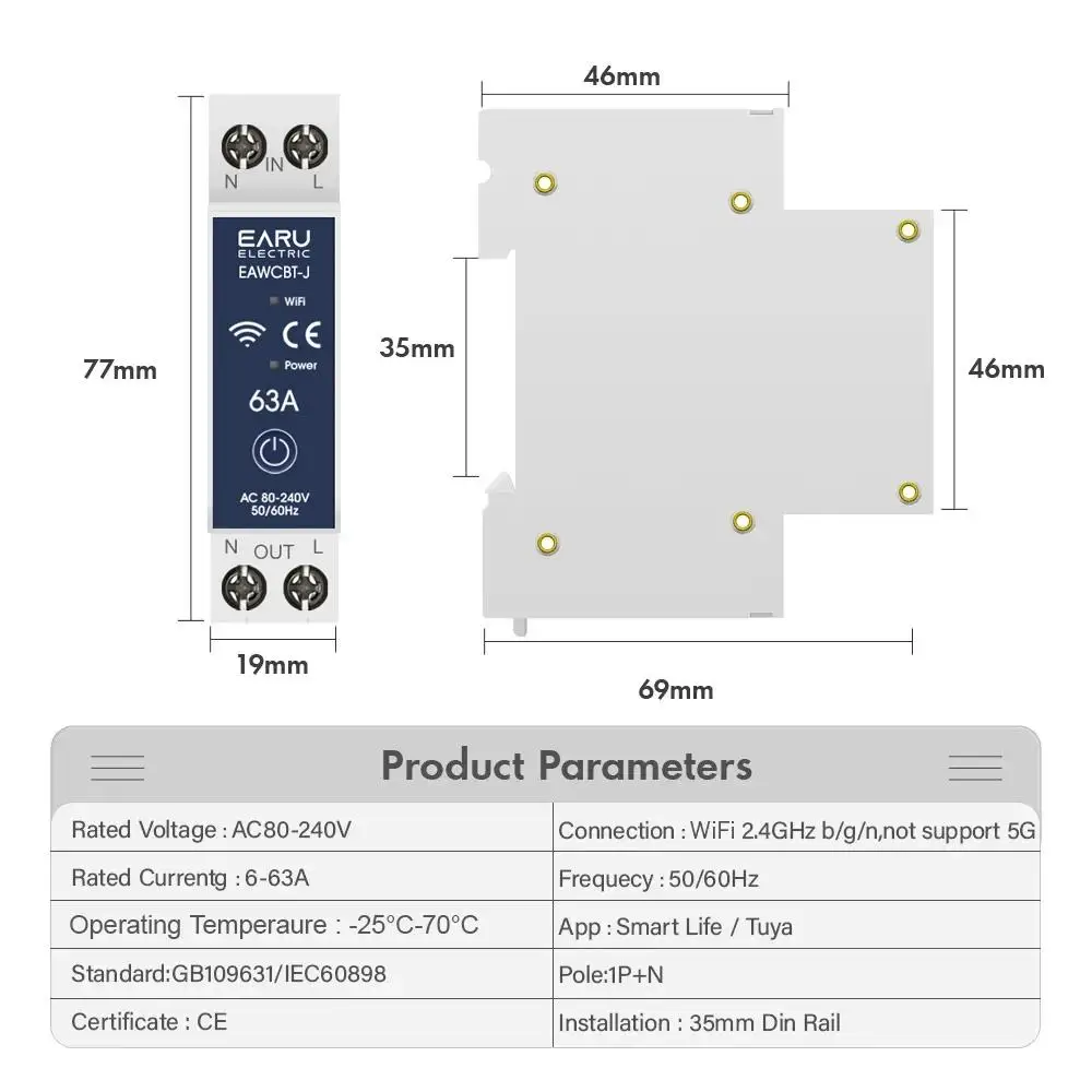 Tuya WiFi Smart Circuit Breaker MCB 1P+N 63A Control Switch